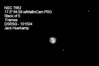 All the images below were produced from video recorded on the night of October 15, 2004 at the Deep South Regional Stargaze. A 17.5" f/4.58 AstroSystems TeleKit with ServoCAT drive system and MallinCam PRO Video CCD Oberservational System were employed to both view all these objects "live"on the screen of a 7" portable DVD player and to record the camera's output onto Hi-8 videotape using a Sony camcorder. The Hi-8 videotapes were copied to DVD, and the DVD segments for each object were converted to AVI files. The AVI files were reduced in size by deleting duplicate frames, and the "decimated" AVI files were processed using RegiStax to produce the images in the album.