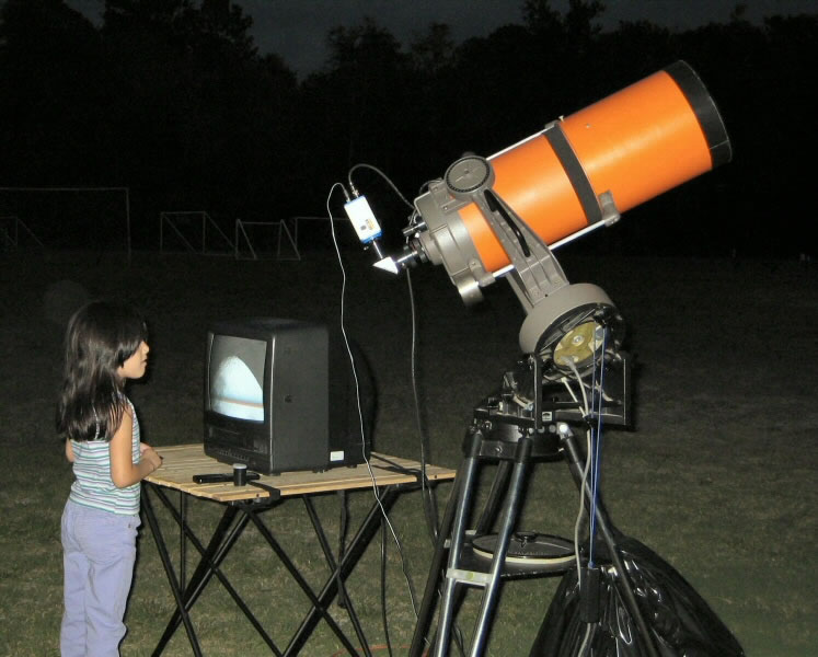 Previous | Home | NextIn 1982, I took the SCT plunge. I had the CT-100 and a 17.5" Dob, but I wanted the portability afforded by this scope. Recently, it has become my scope of choice for use at public stargazes. When an f/3.3 focal reducer/field flatener is installed, it becomes a very fast system for use with my MallinCam Video CCD Cameras. In this picture, a young girl is seen looking at the moon on the monitor at the Abita Middle School Stargaze. |