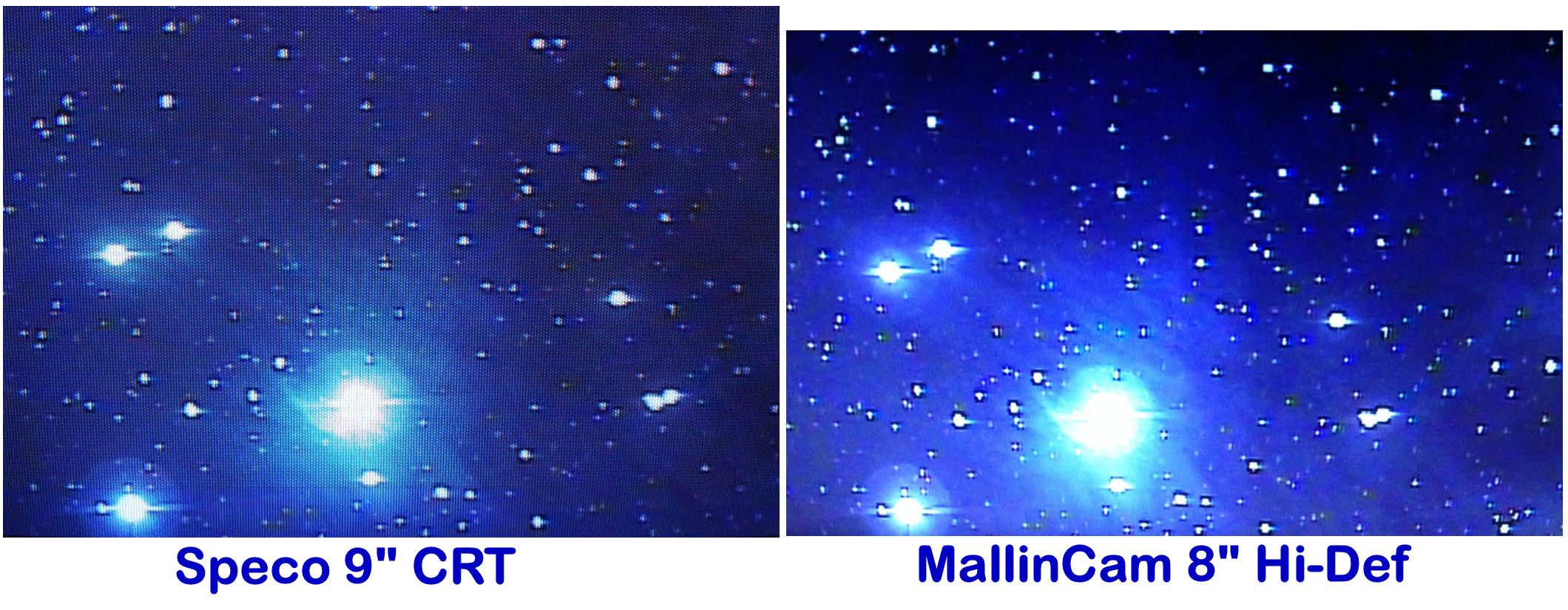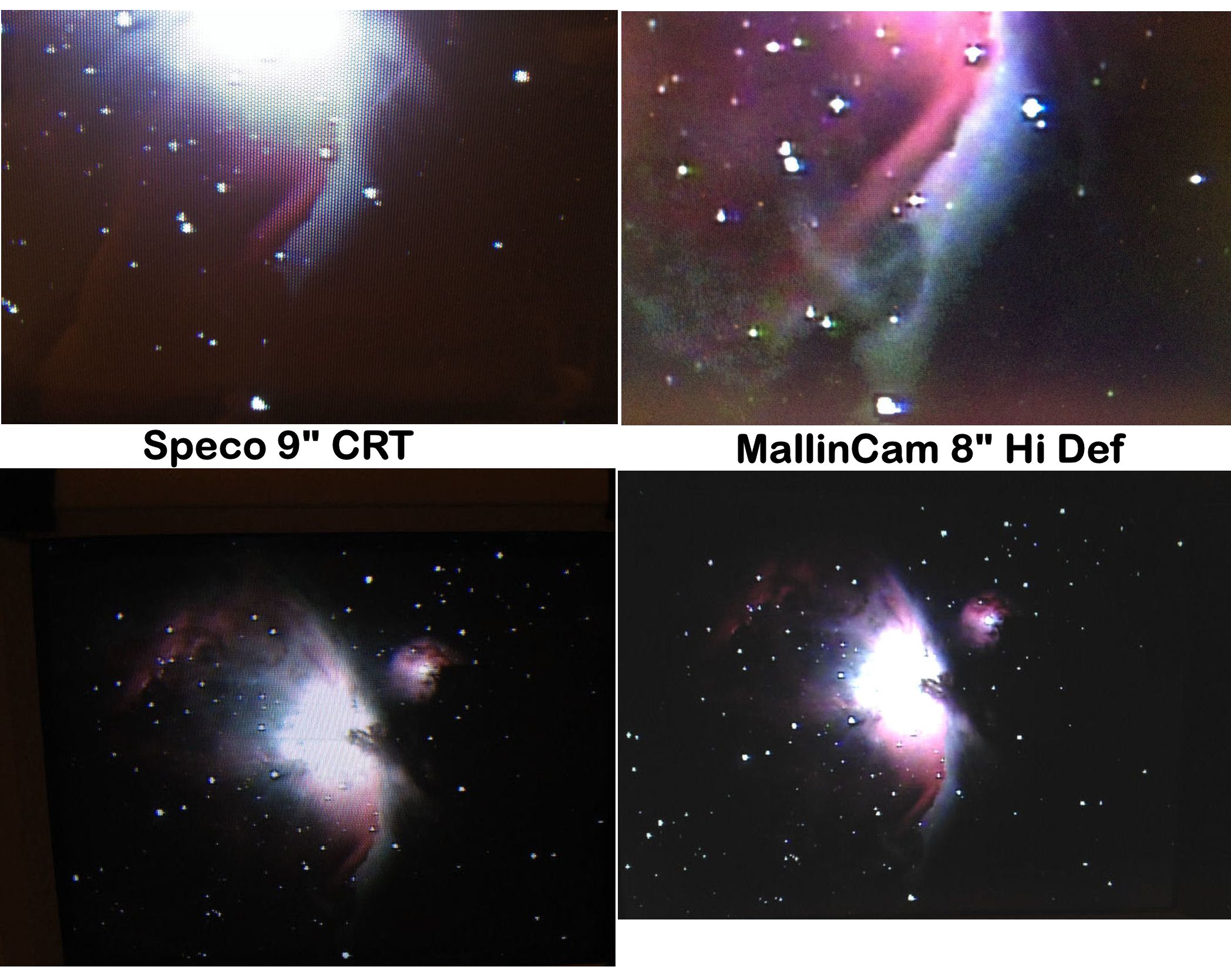 iPhone Images of the 9" Speco and the MallinCam 8" Hi Definition Monitor. The Speco and MallinCam 8" monitors were being fed the same s-video signal via an amplified splitter. However, the signal going to the MallinCam 8" monitos was also passed through the HDMI Upscaler.