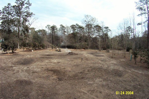 Waning Moon II Site WorkIf I wanted to observe prior to the winter of 2003 at my home in Pearl River, Louisiana, I had to take my telescope from inside the house and set it up before dark. In addition, due to the number of large trees on my property, I was severly limited in the amount of sky I could observe at any one time. Anything past the meridian was off limits, as the small area I could observe from was only clear to the East of Zenith. On December 5th that all began to change. I had a lumber company remove about 20 large pine trees and an equal number of hardwoods from the southeast one-quarter acre on my 2.5 acre lot. This clearing is adjacent to another half-acre clearing in my neighbor's yard to the east of my property. All of a sudden I could see at least a 120 degree section of the sky centered on the Zenith. Below is the cleared area looking from the West tree line toward the East. All the stumps have been ground out and most of the shavings have been removed. I borrowed my neighbors grader box and leveled off all the ruts created by the logging equipment. Design of the observatory is underway, and construction should commence shortly. |